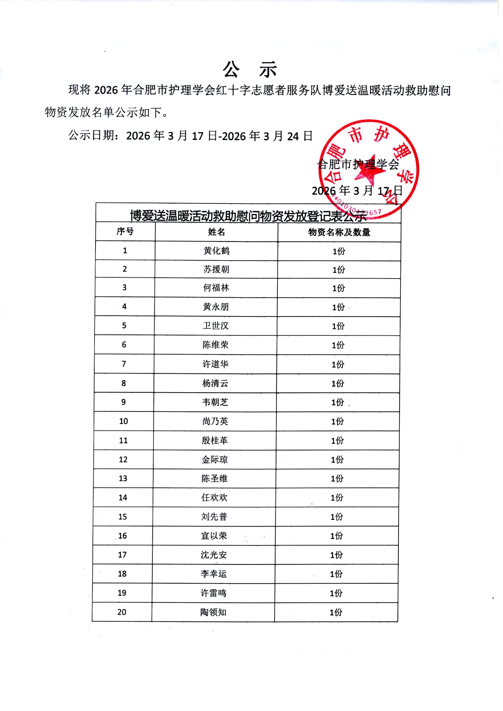 2026年合肥市护理学会红十字志愿者服务队博爱送温暖活动救助慰问物资发放名单公示
