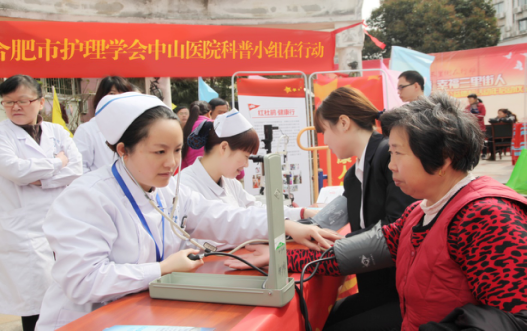 为迎接3.5雷锋日,弘扬雷锋精神,2017年3月4日合肥市护理学会合肥中山医院护理科普领导小组和党员志愿者一行20余人,在瑶海区凤阳社区凯旋大院为社区育龄女性和60岁以上老人送去免费体检公益活动,参加此次义诊活动的专家团队包括:内科、外科、眼科、耳鼻喉科、骨科、中医康复等,活动中共有128位居民享受了免费体检。