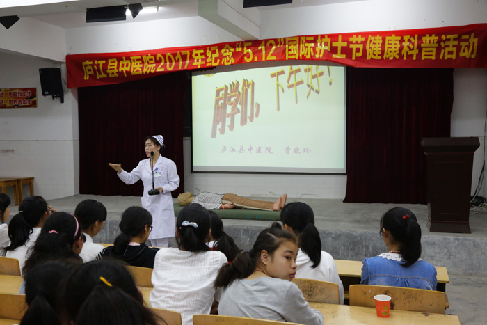 2017年5月11日合肥市护理学会庐江县中医院科普小组专家潘玉荣、曹晓玲、王方苗、王丹一行4人前往庐江县第四中学开展主题为“健康科普知识进校园”的科普巡讲活动。来自庐江县第四中学的200多名师生参加了本次活动。
