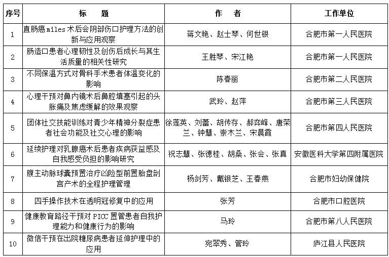 以上10篇论文作者将准备PPT课件在大会上进行交流。其余57篇选送论文以摘要形式编入论文集进行书面交流。合肥市护理学会开展此次论文交流大会旨在提升我市护理人员的专业水平和综合能力。