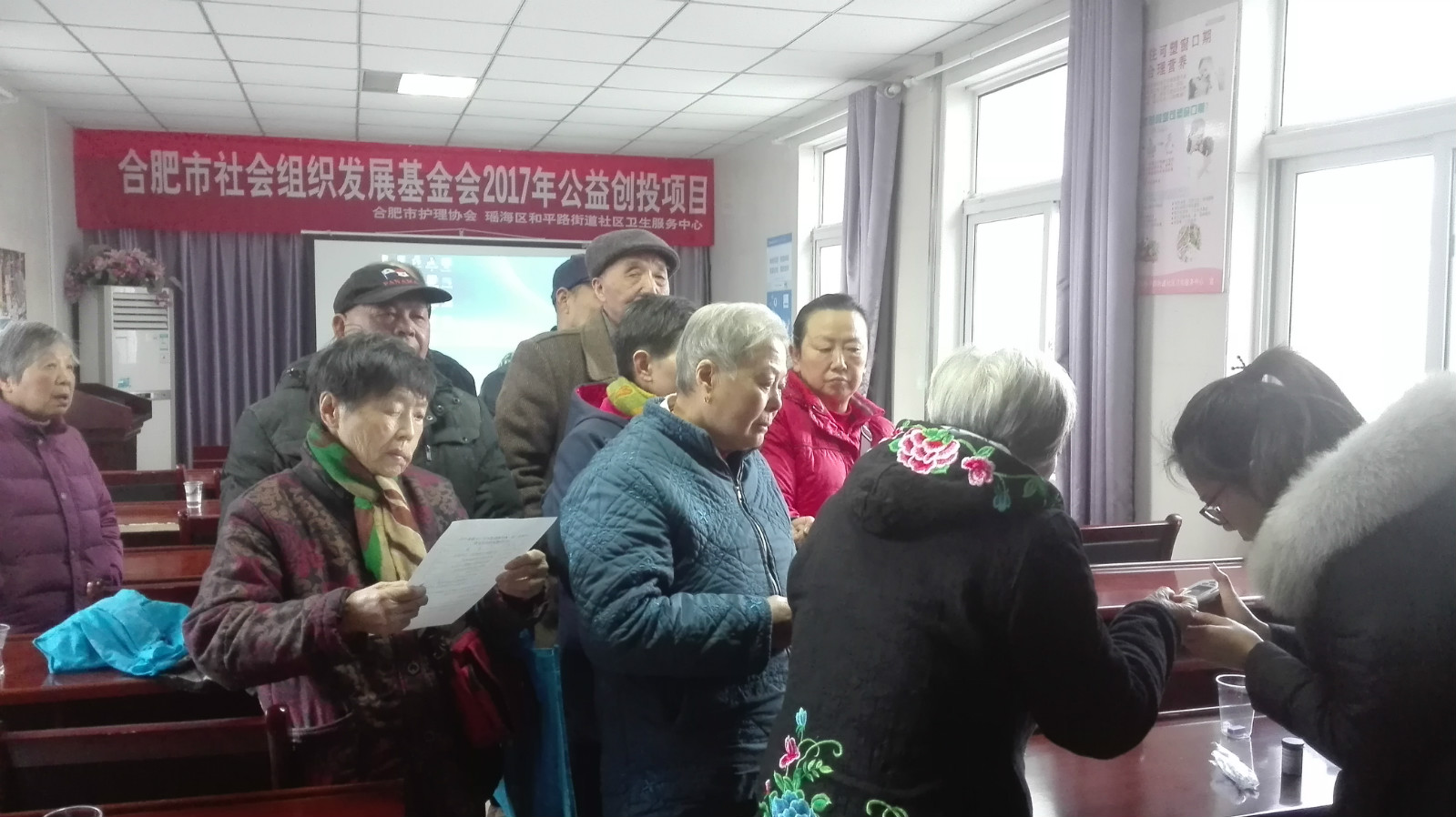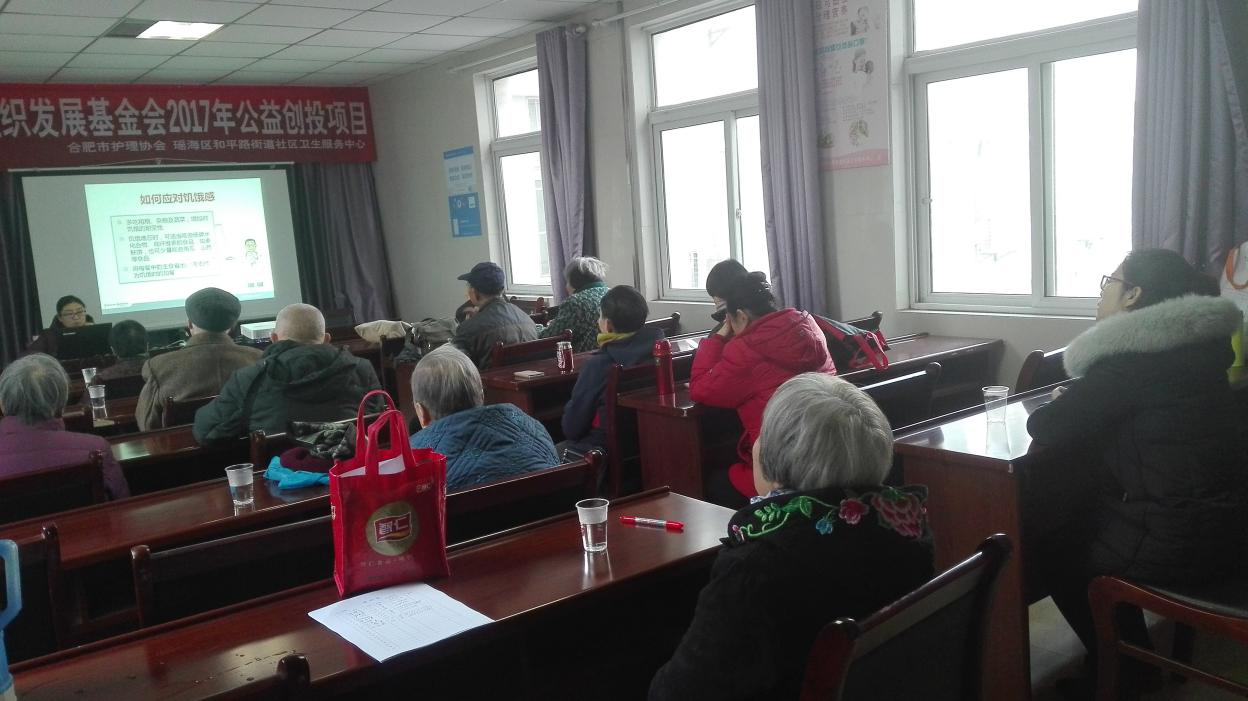 2017年12月25日下午为了深入普及预防跌倒伤害知识,提高老年人自身防跌倒能力,合肥市护理学会罗在琼老师带领合肥市一院专家为社区居民讲解了«老人防跌倒安全防范措施》,重点帮助老年人认识跌倒的现象及危害、跌到的常见原因,教会老人防范跌倒的小技巧以及跌倒后如何处理的知识,同时教会老年人如何消除安全隐患,避免意外跌倒。课间市一院老师还就老人们提出的关于常用药物的服用方法及注意事项做了详细解答。