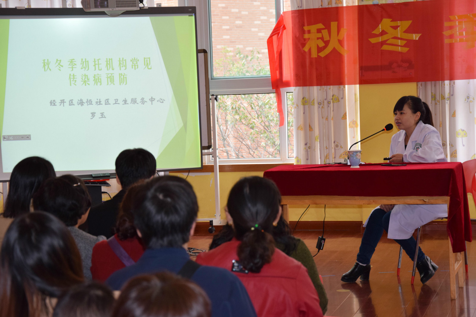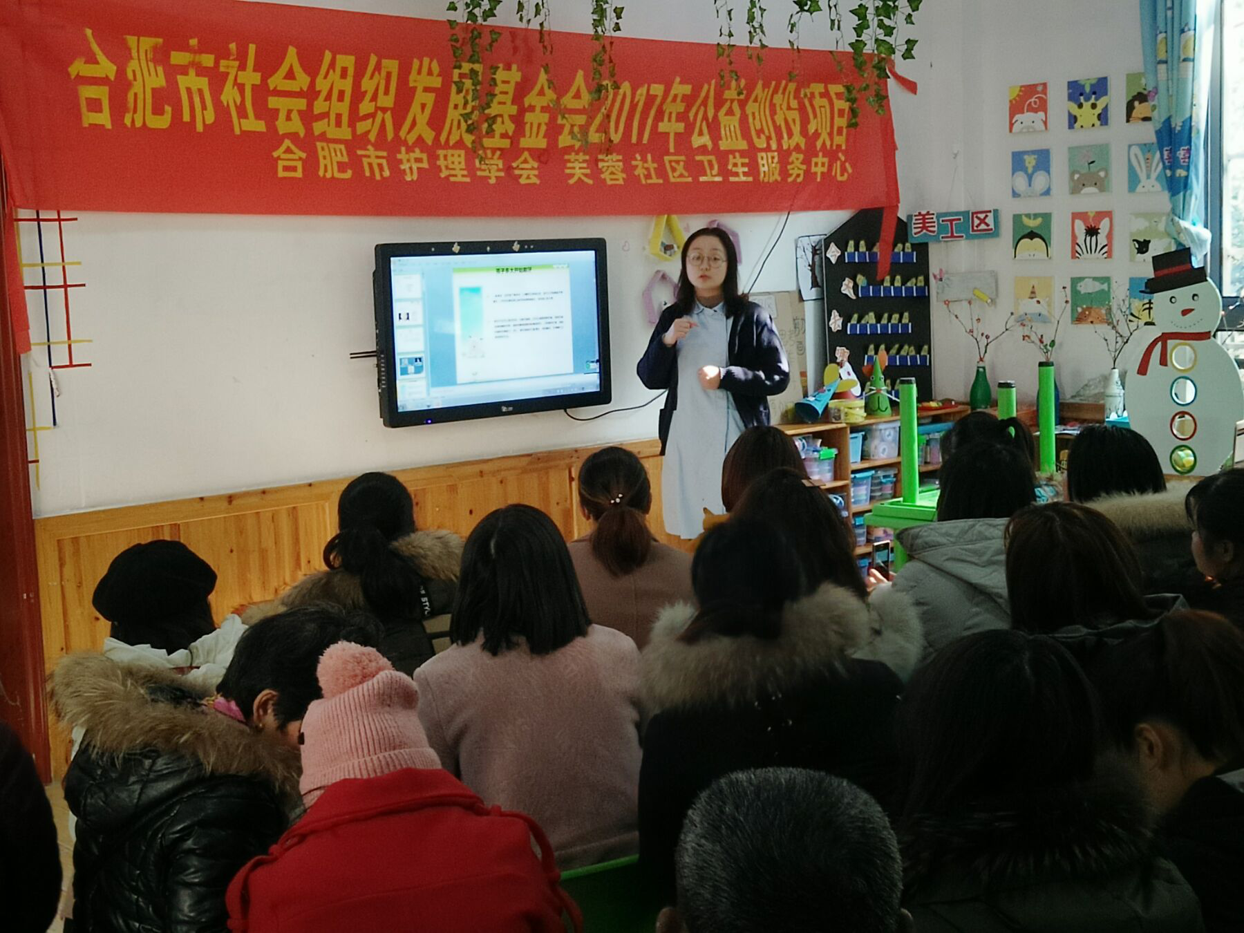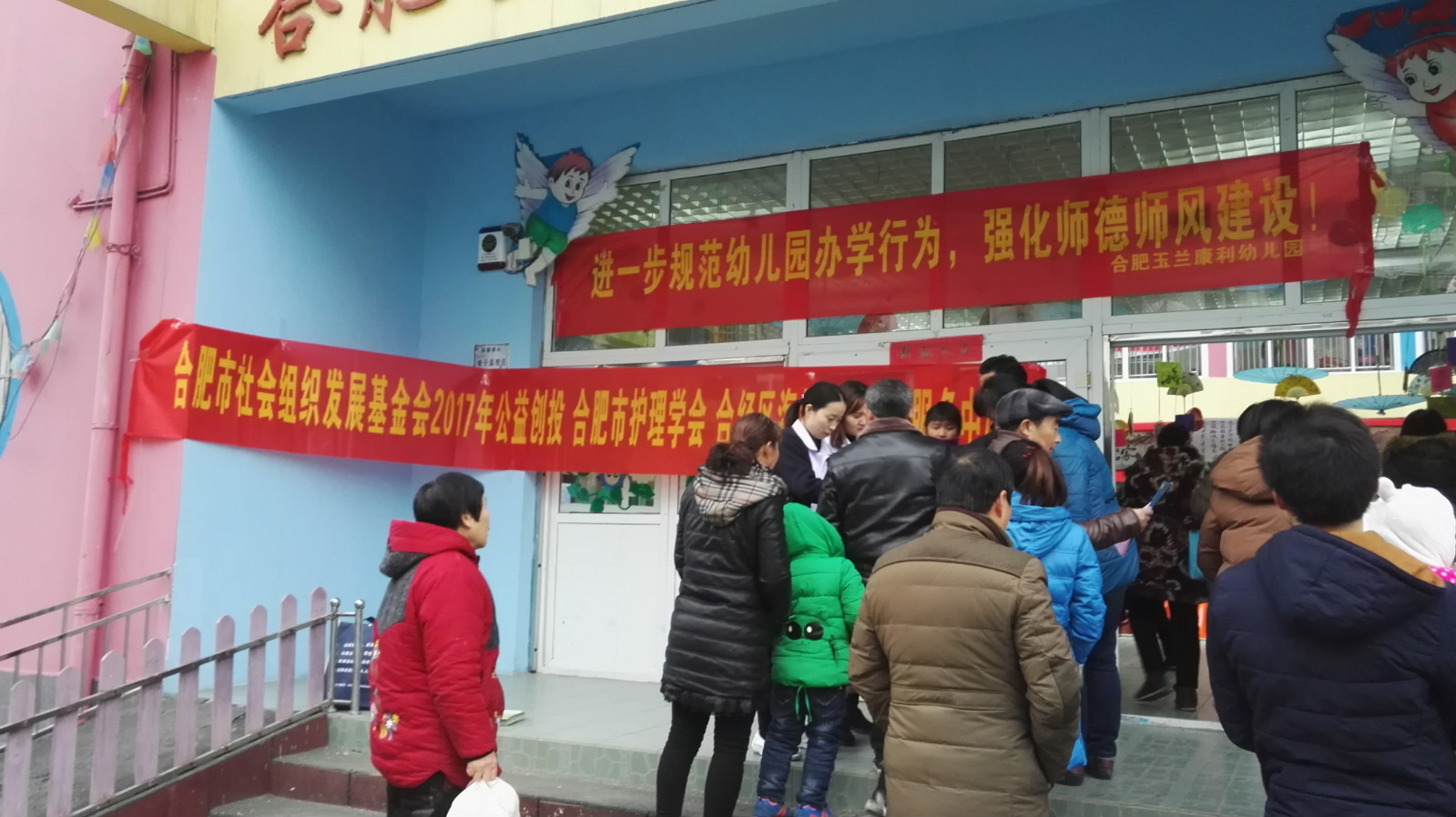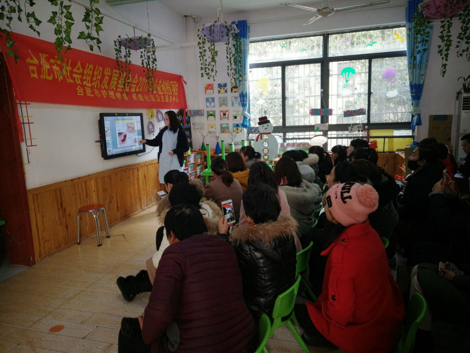 2018年1月8日,合肥市护理学会海恒社区卫生服务中心儿保科医生罗玉走进玉兰康利幼儿园开展秋冬季传染病及常见病的防控知识宣讲活动,53位幼儿家长现场认真聆听。现场活动通过播放幻灯片、悬挂主题条幅、发放宣传单、摆放展板等方式普及托幼机构常见传染病防控知识。活动现场共发放宣传材料300余份。