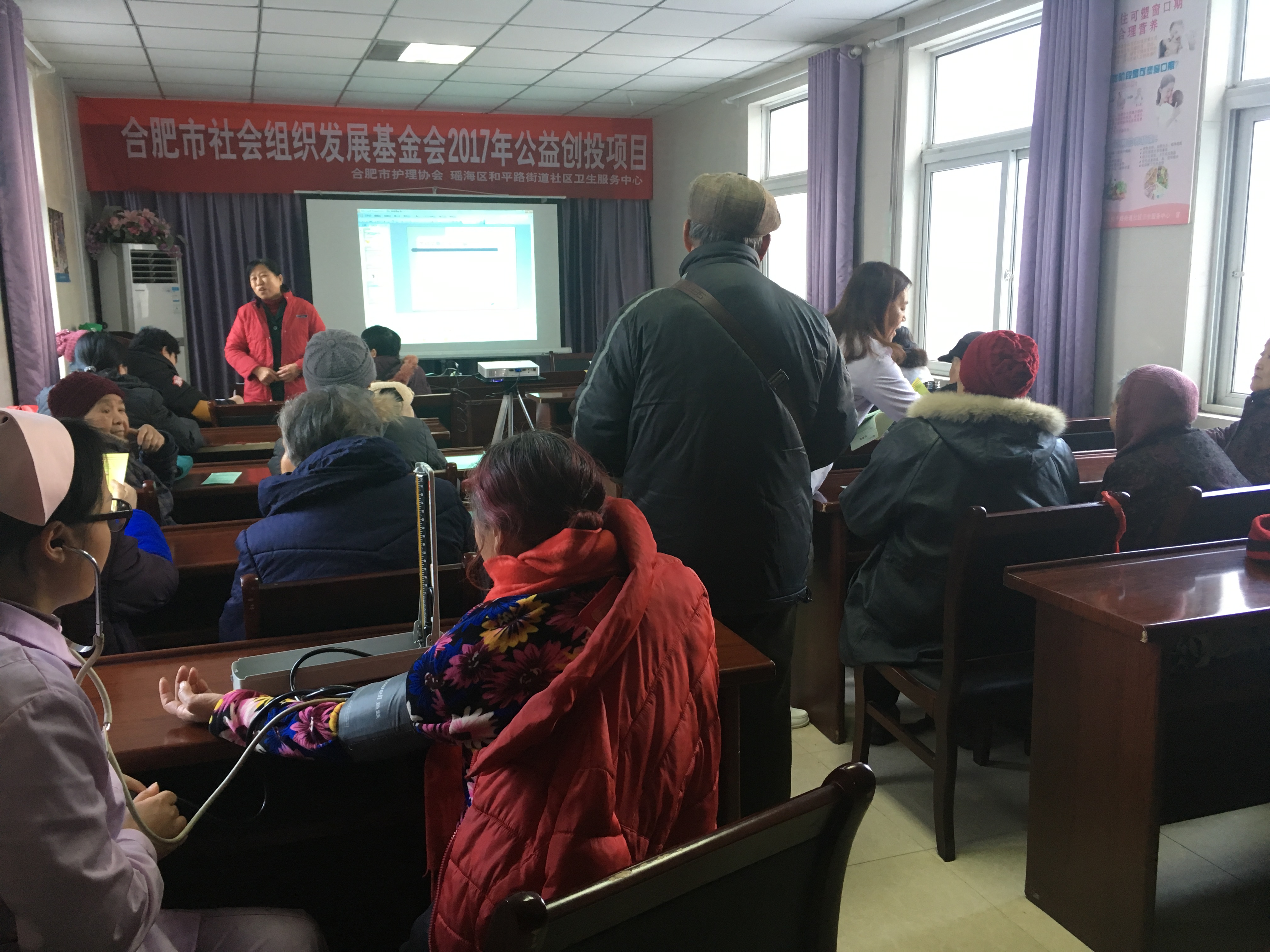 瑶海区和平路街道社区卫生服务中心发现随着天气逐渐变冷,中心心血管疾病就诊的患者在逐渐的增多,为降低辖区心血管疾病并发症的发生,2018年1月12日下午在中心健康教育室举办了《心血管疾病冬季保健》知识讲座,辖区内30多位冠心病、高血压患者和心血管疾病的高危人群参加了此次活动。 下午2:30居民陆续来到会场,中心志愿者为他们送上茶水,免费发放宣传资料和讲义、测量血压。下午3时讲座准时开始,杨医生为大家详细介绍了心血管疾病的高发人群,重点讲解了冠心病的防治知识。最后告诉大家预防冠心病要戒烟、控制血压、调节血脂。抽烟喝酒、大吃大喝、久坐不动是很多冠心病患者的生活方式,要改正这些习惯就能很好的预防冠心病的发生。讲座持续了2个多小时,现场杨医生一一解答居民的提问,同时工作人员送上了小礼品,受到居民朋友的好评。