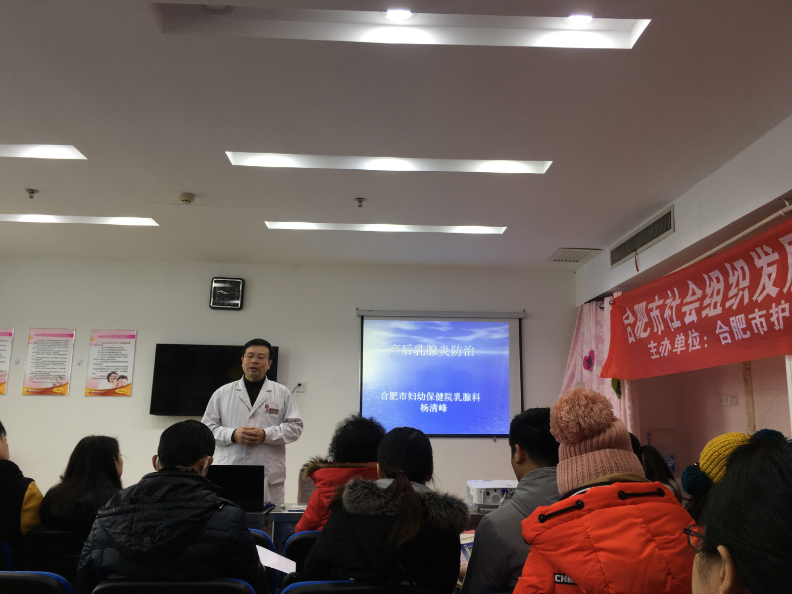 2018年1月27日上午,虽然外面天气寒冷,雪花飘飞,仍有20多位孕产妇及家属的陪同下,一起来到11楼孕妇学校教室听课。今天给他们授课的是合肥市妇幼保健院乳腺科杨清峰主任,杨主任结合模具及临床案例从乳房的结构、急性乳腺炎的病因、表现、发展过程、类型及产后发生乳腺炎的根源到乳腺炎的防治方法等等都做了非常形象生动的讲解,孕妈妈及家属表示生宝宝后一定要按照杨主任说的去做,坚持母乳喂养、按需哺乳,预防乳腺炎的发生。一位孕妈妈还说就是因为身边的朋友哺乳期得了乳腺炎,非常的痛苦,害怕自己也会发生乳腺炎,今天才顶着严寒大雪,慕名来听杨主任课的。