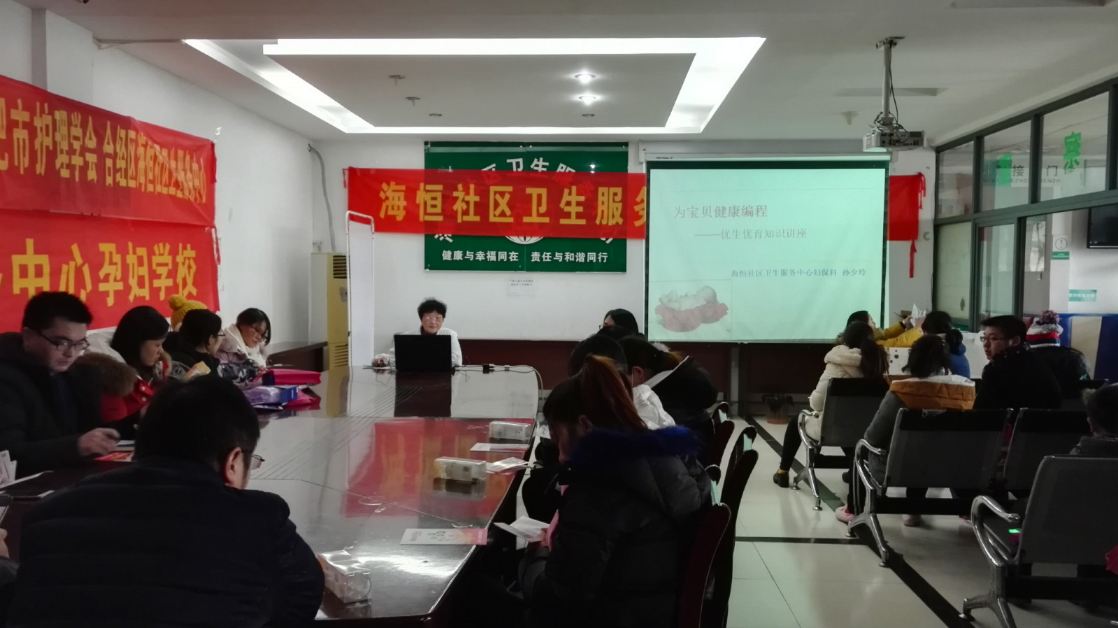 2018年2月1日,海恒社区卫生服务中心妇保科医生孙少玲为辖区的孕妇及家属开展了优生优育主题知识宣讲,43位孕妇及家属现场认真聆听。现场活动通过播放幻灯片、悬挂主题条幅、发放宣传单、摆放展板等方式普及优生优育相关知识与误区。活动现场共发放宣传材料300余份。