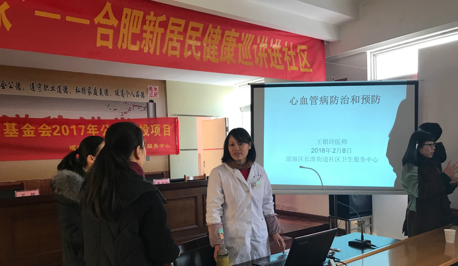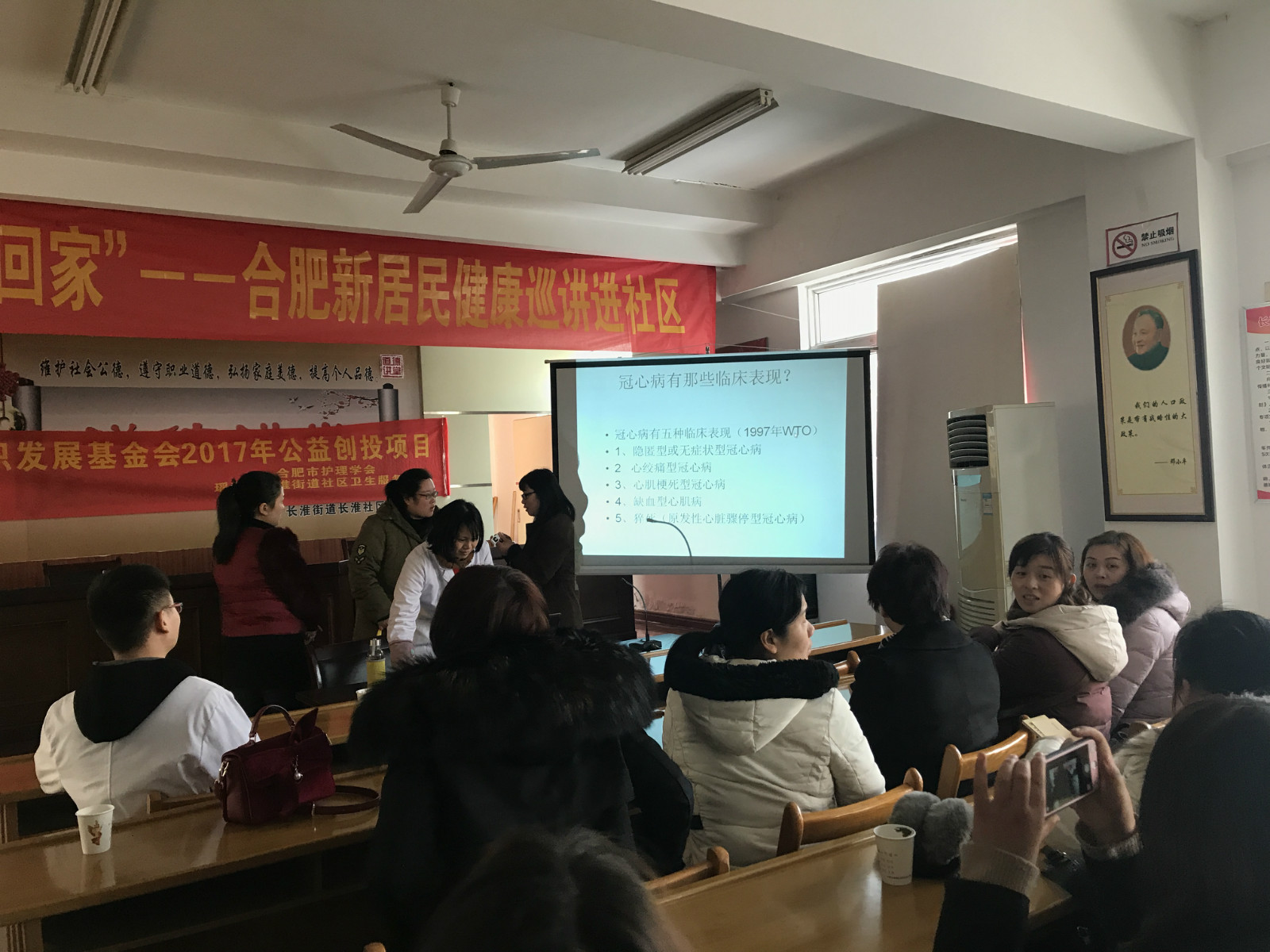 2018年2月8日下午2点,长淮中心全科医师王银玲携全科护士葛馨、轮转医生周亮来到合肥市瑶海区长淮街道长淮社居委开展心血管病宣传讲座。王银玲医生以提问的方式开始了今天的讲座:“大家知道什么是心血管病吗?”这一提问,许多居民陆续开始回答,但从大家了解的情况来说,存在不少误区:有的认为是心脏不好的才是心血管疾病,有的认为是只有高血压的人心血管才会有问题。王医生根据大家所回答的这些问题结合精心准备的PPT课件为大家一一进行解答,在场的居民和工作人员听得十分认真。活动持续近2小时,有近70人参加,发放宣传手册150多张,达到我们预期的效果。活动结束后,王医生还跟大家进行了互动,不仅为居民解答问题,还从中了解到大家对今天这场讲座的掌握程度。获得居民的一致好评!