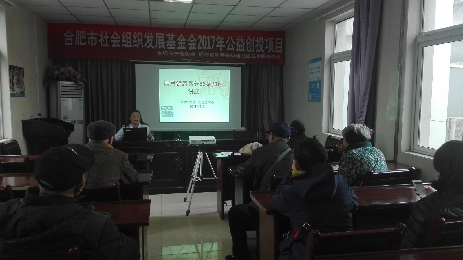 2018年2月8日下午3时,为提高辖区居民健康生活方式,掌握健康素养66条的基本知识,瑶海区和平路街道社区卫生服务中心在中心健康教育室举办了《居民健康素养66条》知识讲座,辖区17位居民参加了活动。下午2:30居民们陆续来到会场,为他们送上茶水,免费发放宣传资料和讲义,3时讲座准时开始王医生为大家详细介绍了健康素养66条中:基本知识和理念25条、健康生活方式与行为34条和基本技能7条。告诉大家健康不仅仅是没有疾病或虚弱,而是身体、心理和社会适应的完好状态。养成良好的生活方式和掌握基本技能和基本知识的重要性。改正不良的生活方式,提高自身的生活水平。讲座持续了近2个小时,工作人员现场解答了居民提出的问题,并送上小礼品,收到良好的效果。