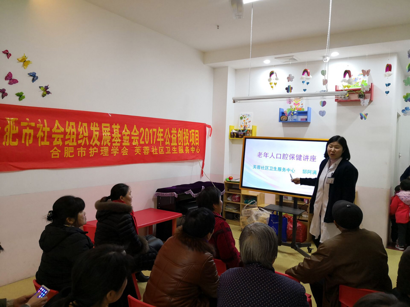 2018年02月28日芙蓉社区卫生服务中心为宣传口腔保健对老年人的重要性,并普及相应的保健知识,由芙蓉社区卫生服务中心公共卫生科的郜阿满医生为老年人讲解口腔保健。内容主要通过这几个方面进行:老年人的多种刷牙方法、牙齿缺损的危害和补救措施、口腔检查的重要性和必要性。由这些主要内容,简洁易懂的方式向老年人较为详细的进行讲解。讲解过程中,也通过牙齿模型让老年人更加容易了解口腔保健的重要性和如何保健。此次的宣传讲座让更多老年人了解老年人口腔保健的意义和重要性,帮助老年人了解如何拥有一个健康的口腔。此次参与讲座的人员共17人。