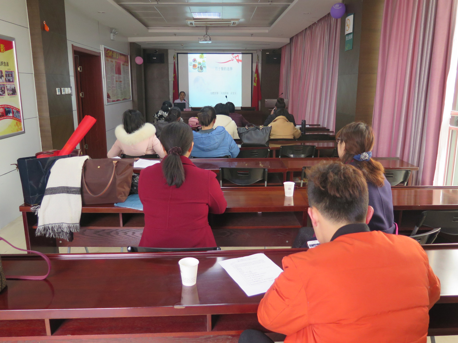 2018年3月12日上午,近40位孕产妇在家人陪同下一起来到孕妇学校11楼教室听课。孕妇学校授课专家结合案例从什么是坐月子、坐月子常见的误区、产后生理特点到产后需注意的事项及护理如个人卫生、活动、饮食、乳房护理、避孕及复查等等都做了非常详细的讲解,通俗易懂,引人入胜,专家讲的精彩,孕妈妈和家属听的仔细认真,教室里挤满了人,板凳不够了,家属主动站起来让孕妈妈做,但没有一个人舍得提前离开,大家都说,这样的课程太实用了,对她们的帮助非常大,现在孕期提前学会掌握,等生后就能科学坐月子,使自己尽快恢复。