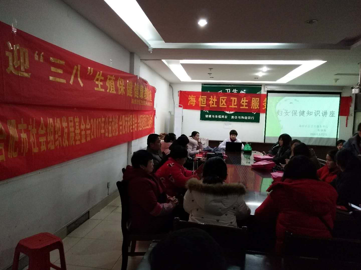 2018年3月7日,海恒社区卫生服务中心妇保科医生邱凤珠为辖区的育龄妇女开展《迎“三八”生殖健康知识宣传》活动,58位育龄妇女现场认真聆听。活动通过播放幻灯片、悬挂主题条幅、发放宣传单、摆放展板等方式普及生殖相关知识与误区。活动现场共发放宣传材料200余份。