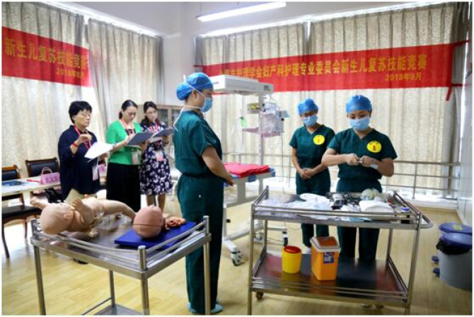 本次竞赛邀请到安徽省护理学会理事长武义华、安徽省护理学会副理事长张建凤、安徽省护理学会秘书长李志菊、安徽省护理学会妇产科专业委员会主任委员胡成文,合肥市妇幼保健院新生儿科主任、国家级新生儿复苏师王慧琴担任评委,比赛采用新生儿仿真模拟模型,设置临床真实场景进行考核,并进行了现场指导。