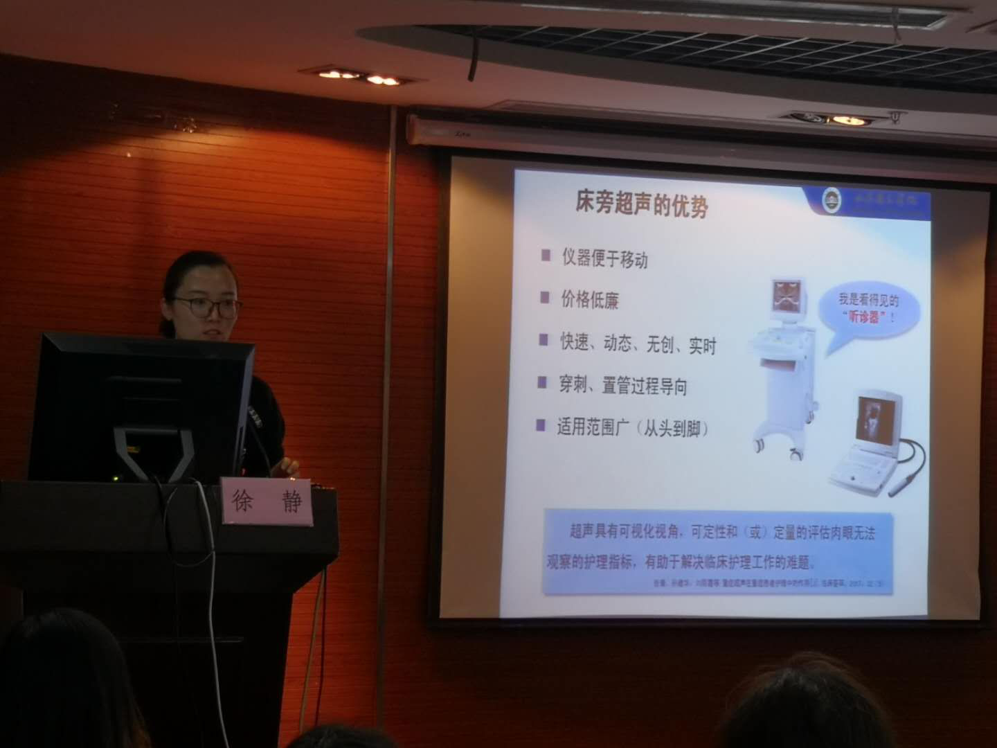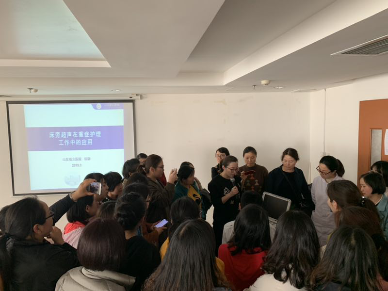 本次会议第二项议程为学术交流,邀请了山东省立医院徐静老师进行《超声在重症护理中的应用》的主题演讲,徐老师将超声在危重患者各类导管置入的定位、膀胱容量判断、胃容量判断、下肢静脉血栓筛查等方面做了详细的讲解,同时进行了现场的实际操作演示,大家学习热情高涨,积极讨论,收到较好良好。