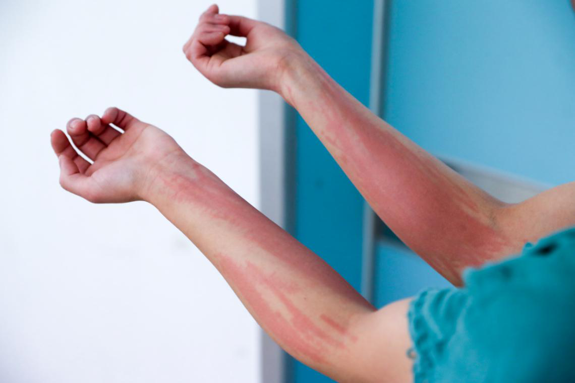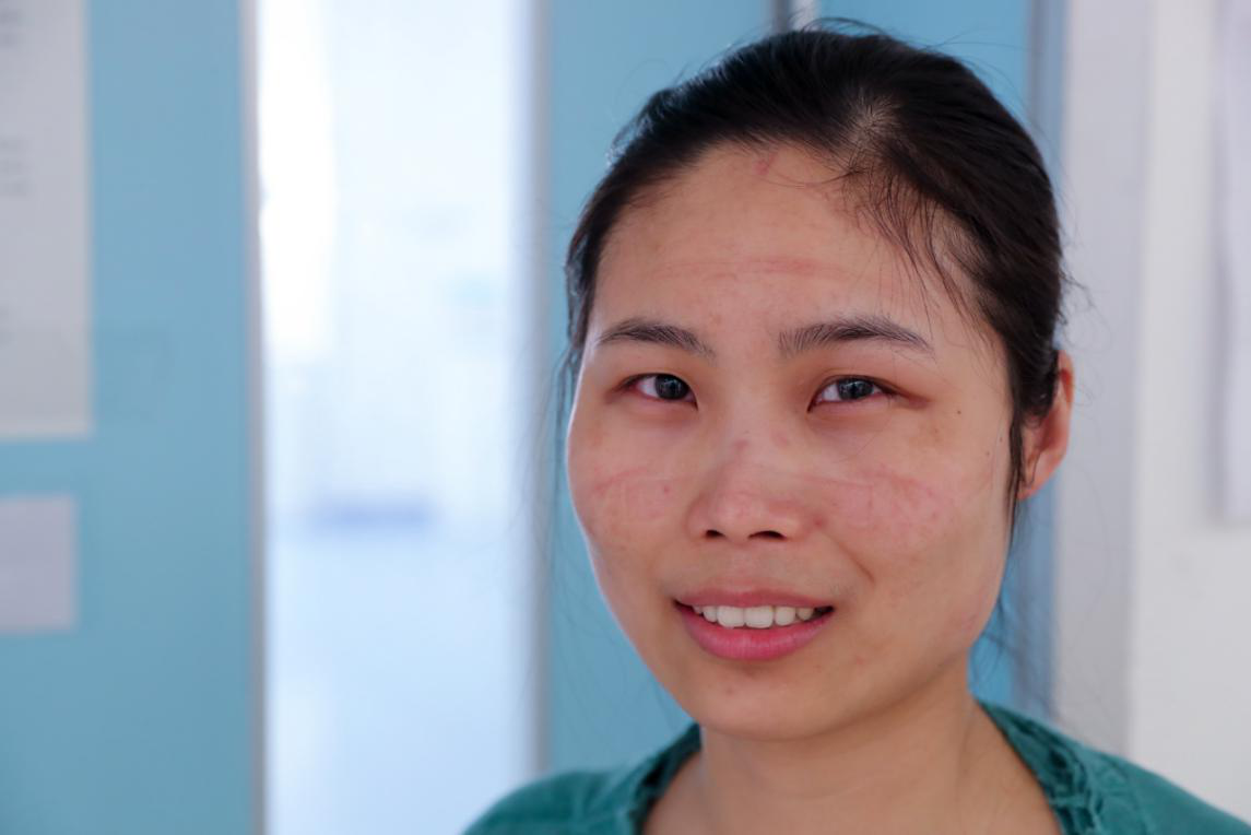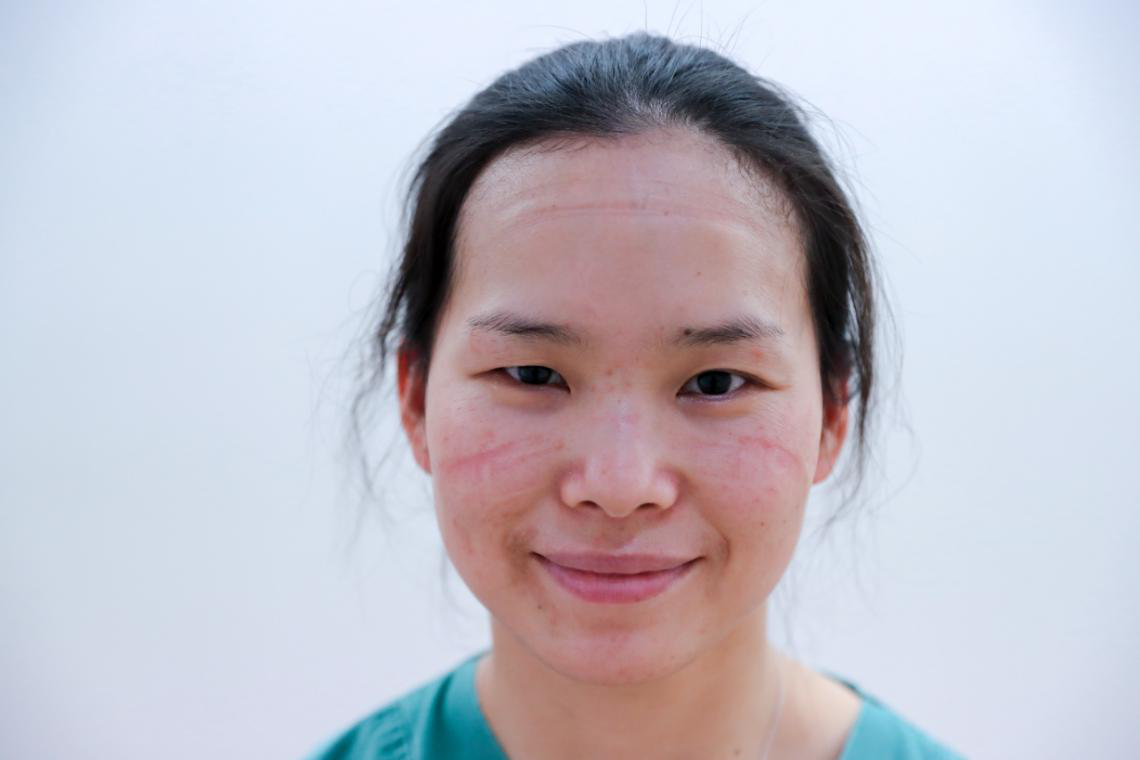 (李芹芹脸上被口罩压出深深印迹,双手因长时间穿隔离衣和搓洗消毒过敏引起的大片红疹)