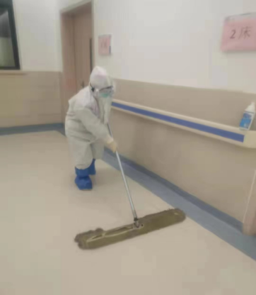 吴问霞说,接到任务后来到到了病区,感知到任务的紧迫和艰巨。作为临时成立的隔离二病区护士长,她井然有序的工作程序和积极的工作热情一下就带动了团队的凝聚力。她始终站在队伍的前方,亲力亲为。为了节省人力资源,便于后期梯队的建立,同时不想再多一名同事增加感染几率,她同护理部领导商量后,即刻由原配置的7人变为6人。每日她都会背负16L重的消毒喷雾箱,坚持一日两次消毒液喷洒消毒病区,紧接着就是对地面、物表进行拖擦,一个流程走下来,毛衣、隔离衣均湿透。为了避免其他人员感染的可能,她主动承担病区卫生工作,不让清扫人员进入,保持病区每个角落的清洁卫生。
