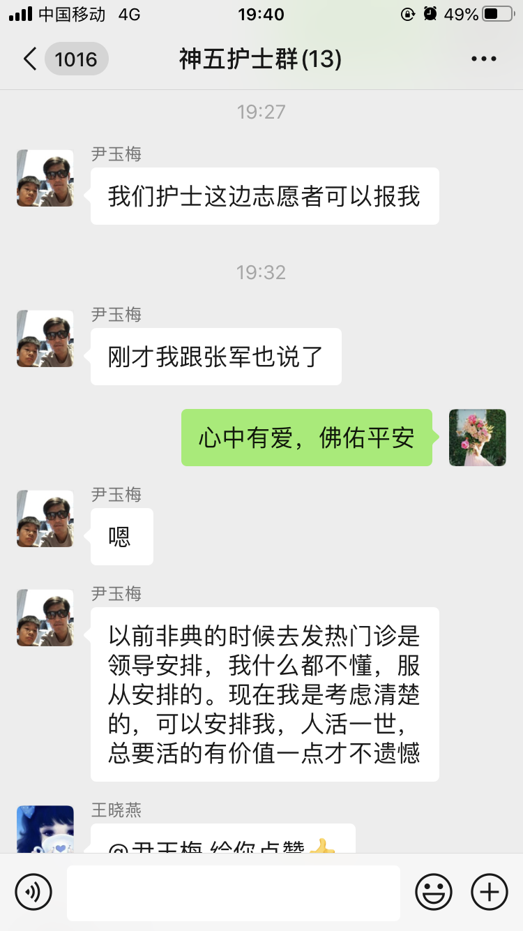 三级护理管理人员群策群力,春节期间坚守岗位。自护理部启动应急防控工作以来,院本部护理部执行主任每天24小时在岗,从年三十至今未回家,坐镇护理部并亲自去重点高危科室指挥,极大的鼓舞了全院护理人的斗志和战胜病毒的信心。分管片内科护士长及各科室护士长也积极配合护理部抽调人员进行防控,部分科室的护士长在科室的人力资源并不充足的情况下,自己亲自顶上,全体护理人心中只有一个信念,那就是战胜病毒。