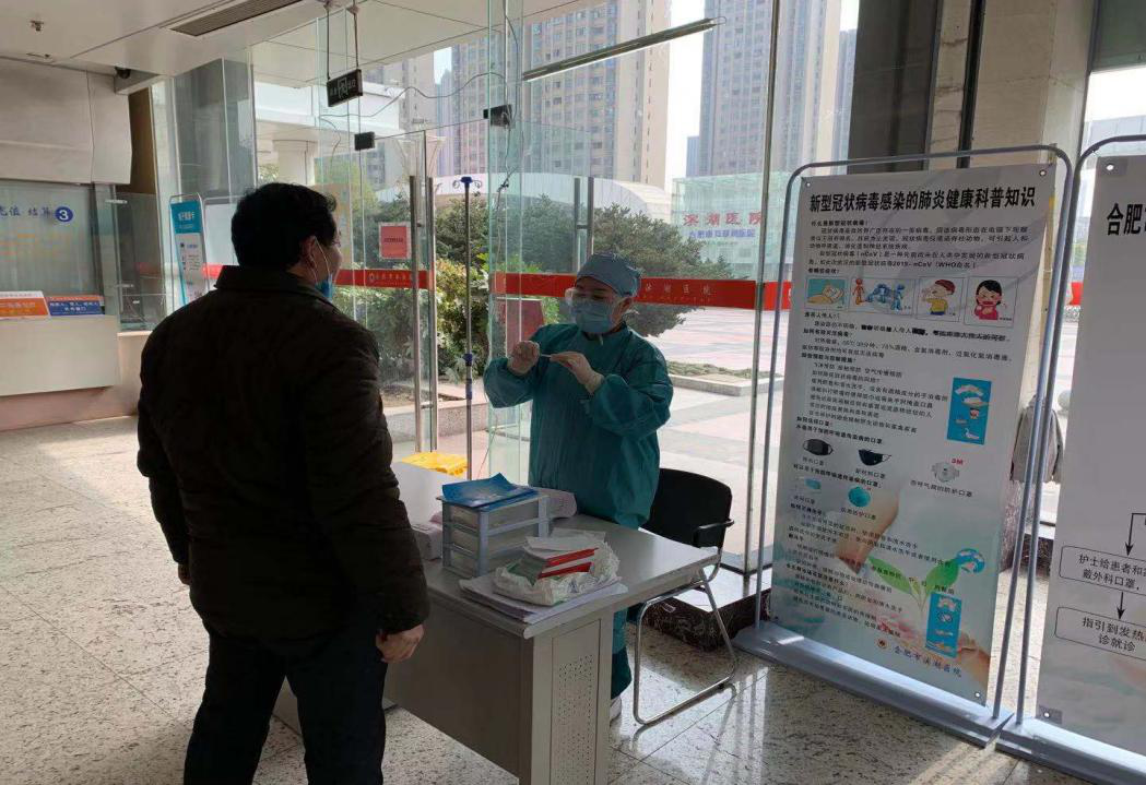 2.12日滨湖医院急诊科护士长刘荆在预检分诊台为病人测量体温