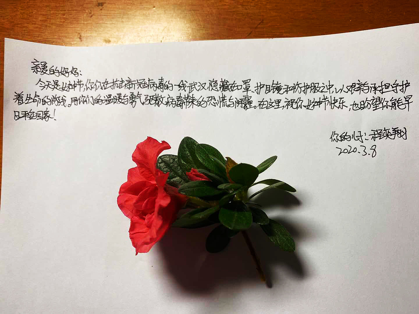 每当夜深人静时,妈妈对你的思念就会越加浓烈,此刻,窗外的夜非常宁静,推开窗,对面居民楼里的人们也是无心入睡,这场突如其来的疫情扰乱了他们的生活轨迹,每一扇窗户后面都是一个家庭的无奈和期盼,我们彼此遥望着,他们对我们的到来所寄予的厚望让妈妈既感荣幸也觉得压力倍增。今天是女神节,结束了一天的疲惫工作回到酒店却收到了一份意外的惊喜,我的“小情人”终于知道给我送
