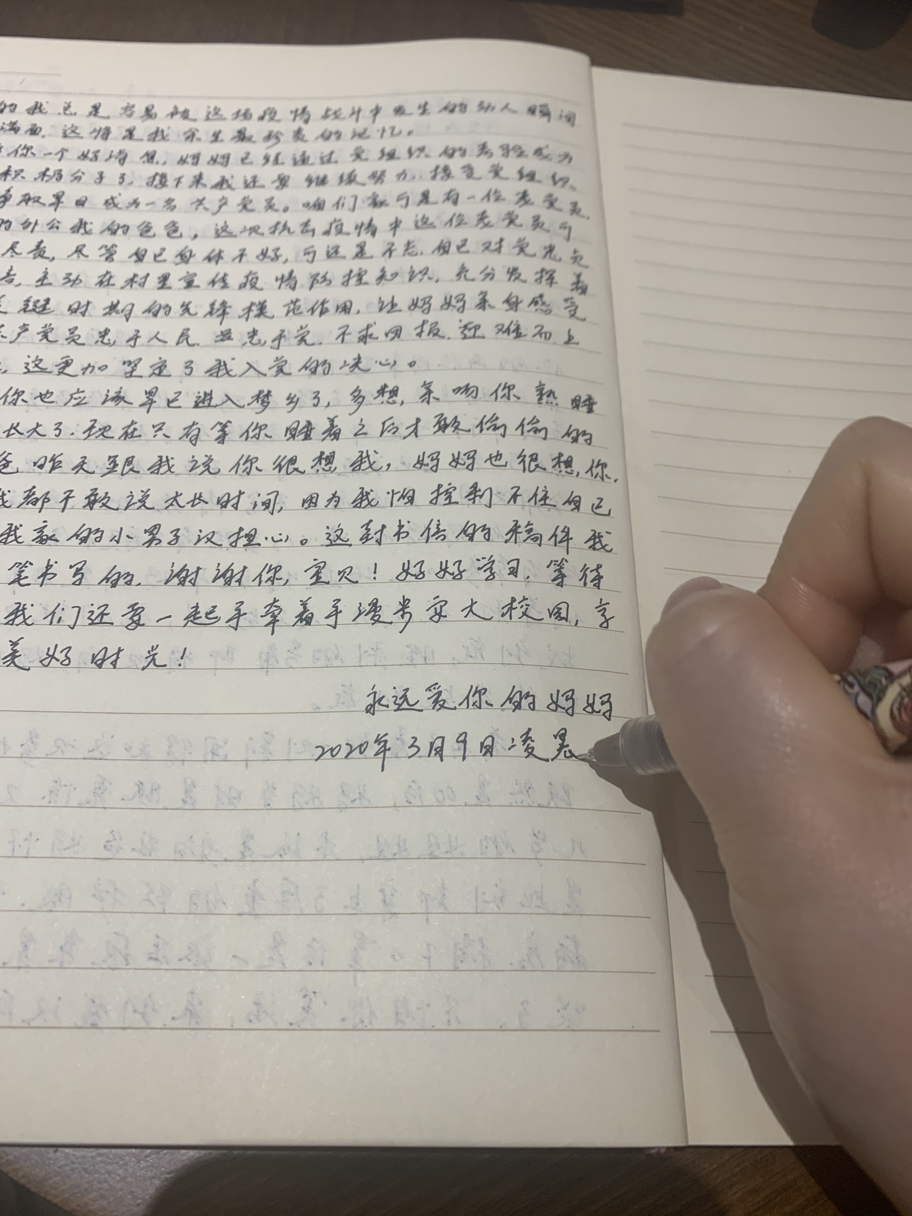图二:3月9日凌晨,武汉铂顿国际公寓,合肥市第三人民医院呼吸内科护师孙海燕用儿子送的钢笔书写家书一封,表达对孩子的思念之情