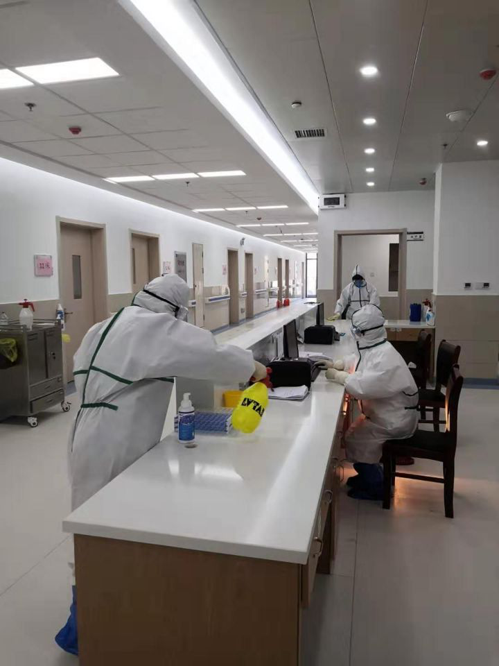 面对疫情的严峻和紧迫,我深知这是一场与瘟神殊死搏斗的恶战!需要做好战役方案。为了节省人力资源,便于后期梯队的接力,同时不想再多增加一名同事的感染几率,我立即向护理部领导汇报请示后,由原来的七人小组配置核减为六人小组。既然少了一人,我们的工作量自然会多得多,必须自己身先士卒,先承担下来。消毒隔离工作是隔离病区工作中的重点,也是最繁重的任务,任何一个环节的疏漏都可能造成病毒的传播。背起消毒箱,一个趔趄,从脚底到头顶的热气立刻沸腾。消毒液喷雾、拖擦、医疗废物的严密消毒、垃圾袋层层密封装箱……吃奶的劲都使出来!汗流浃背、呼吸粗重、心跳加速、头晕目眩,所有的声音都恍如隔世之音。蹲下来,与地面接得越近,空气的新鲜度越高,呼吸逐渐顺畅,汗水的热度渐渐退去,护目镜里的雾气结成凝露滴落,是免费的汗蒸、桑拿啊!脱下防护服已经是下午四点,汗湿的衣物早已捂干。将中午的饭菜微波炉转一转,简单地扒拉几口。“护士长,9床宝宝的血我没抽出来。”“好的,我来。” “护士长,1床的病人在哭闹,我安慰了效果不好。”“好的,我马上过去!”
