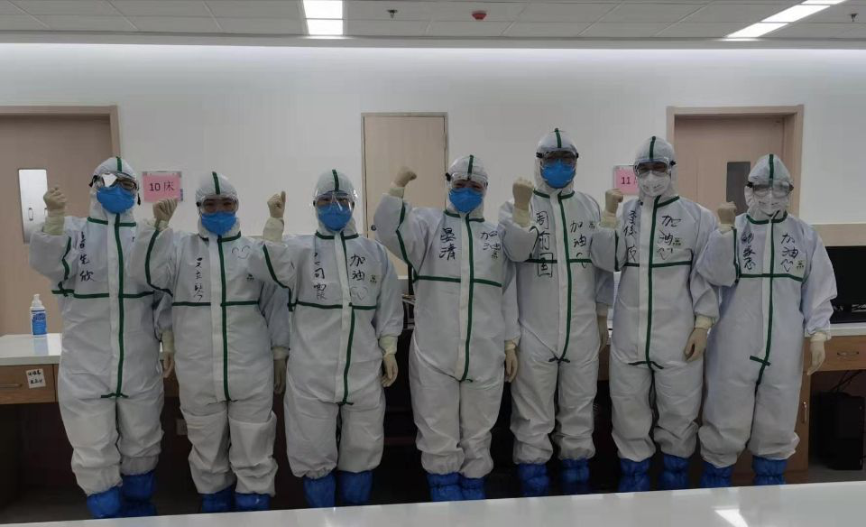 图二:2月6日,在撤出隔离病区的前一天,吴问霞带领医护团队为下一批队友加油鼓劲!