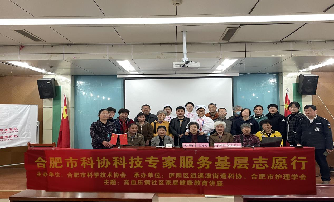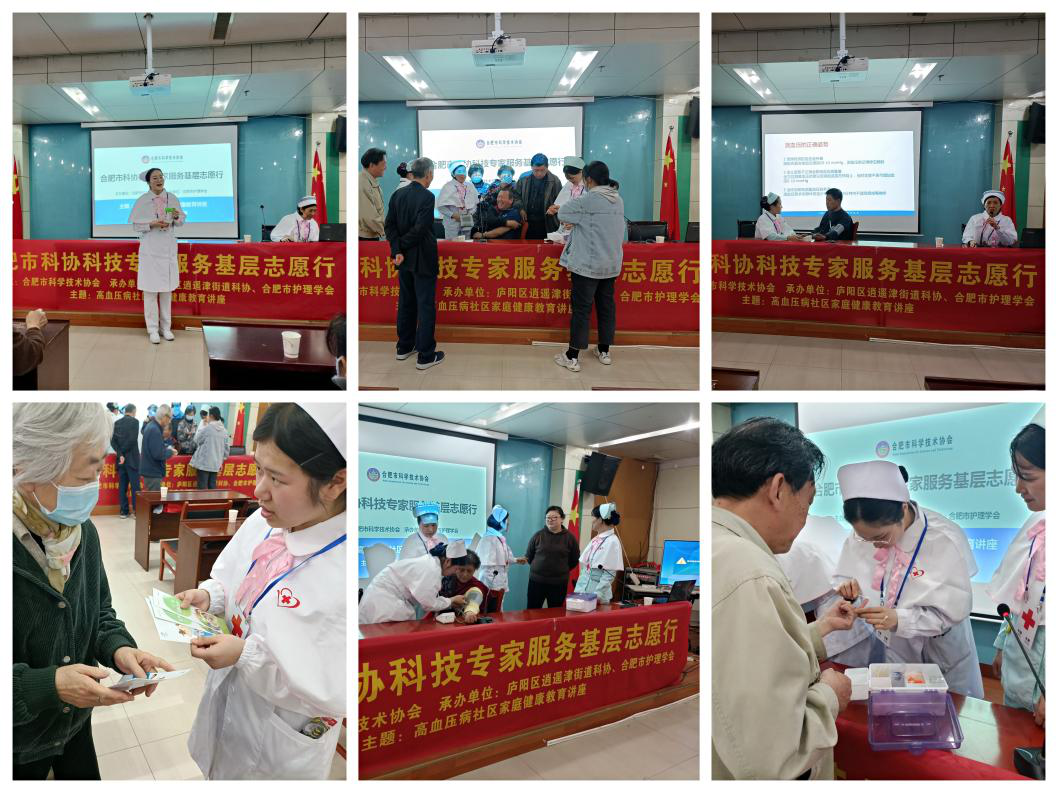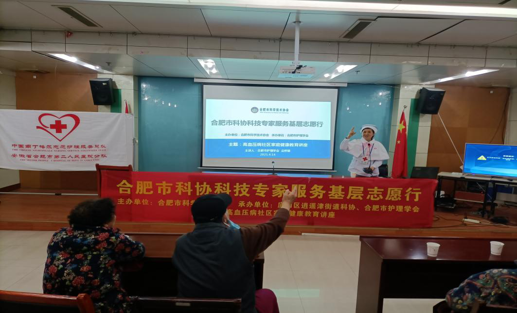 为了增强社区居民自我健康状况的关注度,增加居民对高血压病的认识,2021年4月14日合肥市护理学会、合肥市科协在逍遥津街道科协礼堂开展高血压健康教育讲座,该讲座由合肥市护理学会副秘书长、合肥市第二人民医院护理部副主任袁修银和其他四名护理志愿者(合肥市护理学会会员)共同完成,社区60多位民众参与了此次活动。