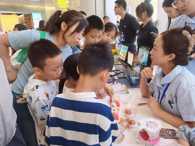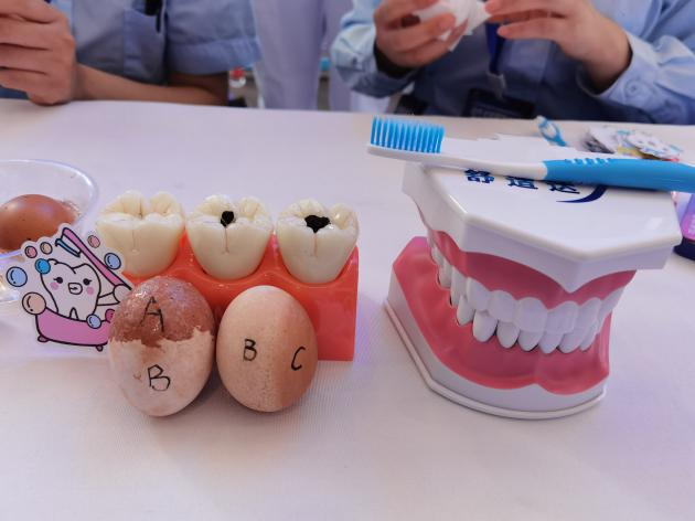 同时用简单的科学小实验帮助家长和小朋友直观地了解怎样保护自己的牙齿,通过以下三个实验:①酸蚀试验观察酸性物质对牙齿的腐蚀现象。②什么是窝沟封闭:在牙齿模型上认识什么是窝沟,介绍窝沟为什么容易龋坏,用白色黏土覆盖窝沟,模拟窝沟封闭操作,解释窝沟封闭对牙齿的保护作用。③氟的保护作用:将氟涂在鸡蛋的一边,将鸡蛋放置于白醋中约2~3分钟后将鸡蛋取出,用湿巾擦拭鸡蛋表面,观察涂氟与未涂氟的鸡蛋表面有何变化,解释氟对牙齿的保护作用。以及如何定期进行口腔检查等实用的口腔护理知识,她们的实验充满了趣味性和互动性,引得大家纷纷提问并积极互动。参与者们纷纷表示此次活动让他们收获颇丰,知晓专业的口腔保健知识有利于她们生活质量的提高。